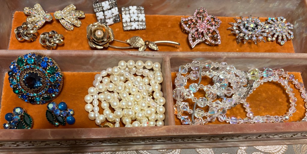 My friend, Diann, called to see if I had anything “70’s” that she could borrow to wear to an Oscar party a few months ago. I went upstairs to my cedar closet and start pulling out a dress, some tops, and sweaters that I have held on to. Then we started talking accessories so I opened a jewelry box that has things that belonged to my mother and grandmothers,